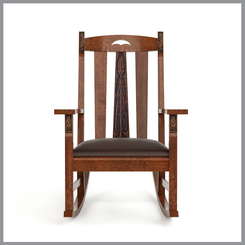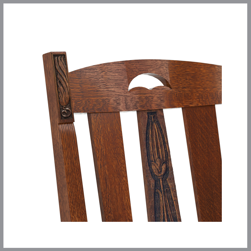 Drawn from our new LaSalle capsule collection, this year’s Collector Edition is the grandly scaled LaSalle Rocker, inspired by a Stickley Bros. original. The distinctive feature of this comfortable seat is a reverse-tapered center back splat with intricate carving, and additional carved details appear on its front and rear posts. Its drop-in seat cushion is covered in your choice of the Colman leathers, and atop the seat back, a decorative cut-out also serves as a handle for repositioning the chair.